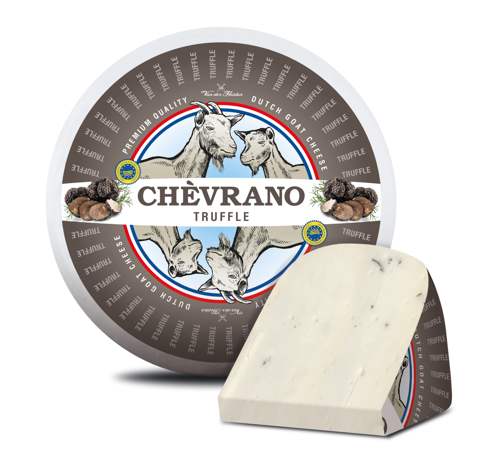 Chèvrano Tryffel är en holländsk getost av premiumkvalitet som kombinerar den krämiga getmjölkens sötma med den jordiga aromen från äkta svart tryffel. Osten är tillverkad av pastöriserad getmjölk och är halvhård till hård med en slät textur. Den passar utmärkt som ett lyxigt inslag på en ostbricka, men är även god att riva över en pasta eller risotto.