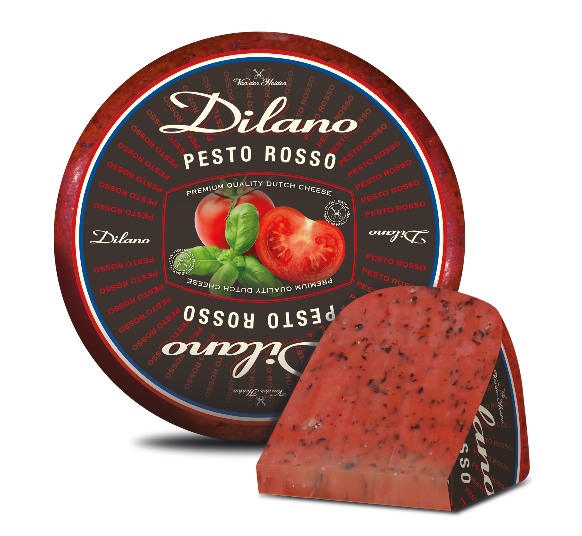 Dilano Gouda Pesto Rosso är en färgstark holländsk delikatessost tillverkad av pastöriserad komjölk och som kombinerar krämig gouda med de klassiska smakerna från röd pesto. Osten får sin livfulla röda nyans genom tillsats av ingredienser som soltorkade tomater, paprika och ibland chili, vilket ger den ett karaktäristiskt marmorerat utseende. Texturen är halvfast och smidig, vilket gör den lätthyvlad och idealisk för att ge både färg och smak till ostbrickor, pastasallader eller varma smörgåsar.